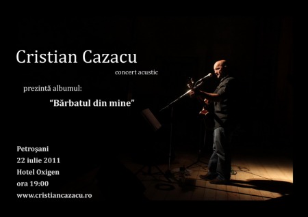 Share Facebook Twitter LinkedIn Pinterest Email Vineri, 22 iulie 2011, Cristian Cazacu va susţine un concert acustic si va prezenta albumul: “Bărbatul din mine”. Evenimentul va avea loc în Petroşani, la Hotel Oxigen de la ora 19:00. Pentru mai multe detalii: www.cristiancazacu.ro Apreciază:Apreciază Încarc... Concerte Cristian Cazacu
