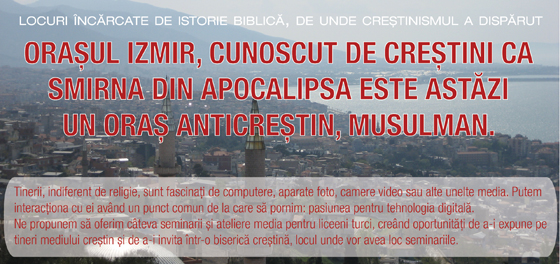 În perioada 5 – 15 septembrie 2011, o echipă formată din profesori şi studenţi de la secția Jurnalism – Pregătire Media a Colegiului Biblic Est European va pleca în Izmir pentru a sprijini lucrarea de misiune a unui absolvent CBEE, stabilit ca misionar în Turcia, prin câteva seminarii media adresate tinerilor liceeni din Izmir.