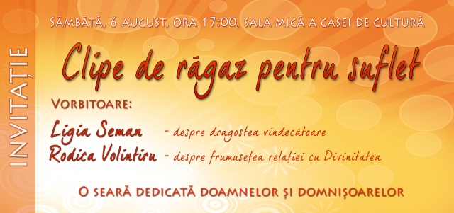 Sâmbătă, 06 august, ora 17.00, în sala mică a Casei de Cultură, ” Clipe de răgaz pentru suflet”.