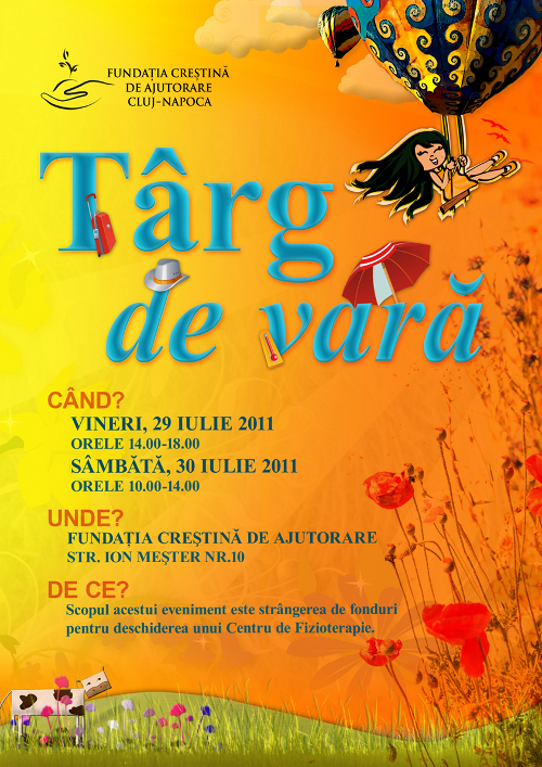 Fundația Creștină de Ajutorare organizează Târg de vară, vineri – 29 iulie orele 14.00- 18.00 și sâmbătă – 30 iulie orele 10.00- 14.00, str. Ion Meșter nr. 10 – cartier Mănăștur.