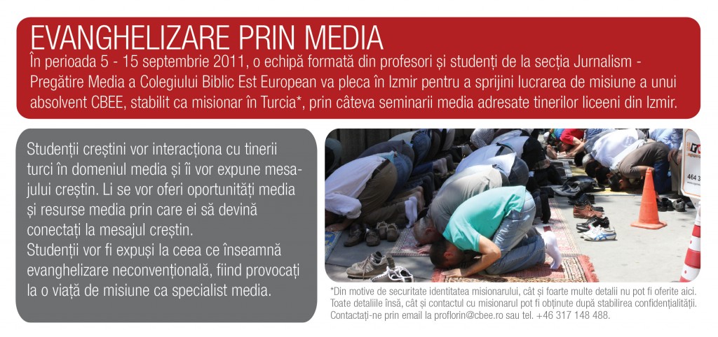 În perioada 5 – 15 septembrie 2011, o echipă formată din profesori şi studenţi de la secția Jurnalism – Pregătire Media a Colegiului Biblic Est European va pleca în Izmir pentru a sprijini lucrarea de misiune a unui absolvent CBEE, stabilit ca misionar în Turcia, prin câteva seminarii media adresate tinerilor liceeni din Izmir.