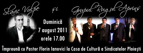Slavic Vulpe şi Grupul Rugul Aprins, împreună cu pastorul Florin Ianovici vă aşteaptă la Casa de Cultură a Sindicatelor, începând cu ora 17:00