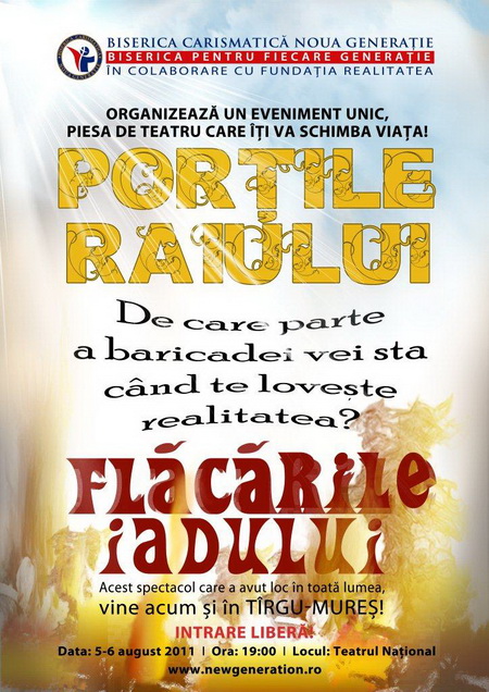 Biserica Carismatică ¨Noua Generație¨ în colaborare cu Reality Ministry, vă invită să participați la piesa de teatru Porțile Raiului și Flăcările Iadului.