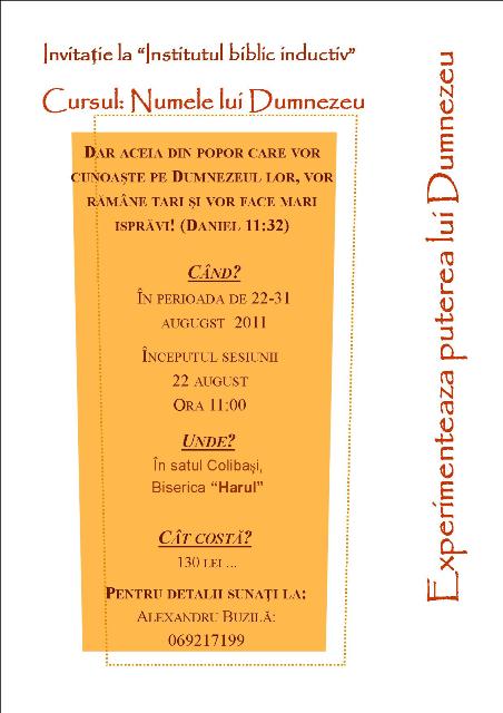 În perioada, 22-31 august 2011 la Colibaşi se va desfăşura sesiunea “Numele lui Dumnezeu”. Evenimentul organizat de învăţătorul Alexandru Buzilă în cadrul filialei de sud a Institutului Precept Ministries Moldova cheamă doritorii de a cunoaşte caracterul lui Dumnezeu şi de a se odihni în Cuvântul Lui. Dă lui Dumnezeu 10 zile din viaţa ta pentru ca El să te poată binecuvânta cu cunoaştere şi putere de a rezista ereziilor şi atacurilor diavolului. Cunoaşte-L pe Dumnezeul tău prin sursa divină – Cuvântul său. Costul sesiunii este de 130 de lei. Transmiteţi acest anunţ şi la alţi creştini. Chemaţi la cercetarea Scripturilor şi pe cei ce au nevoie de putere şi întărire spirituală.