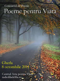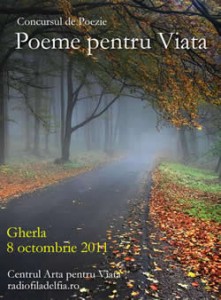 Din data de 1 septembrie – 2 octombrie 2011 , iubitorii de poezie pot trimite versurile originale , avand ca tema “Iubirea din Dumnezeu” la Concursul de poezie “Poeme pentru Viata”. La concurs se pot inscrie persoane din tara si strainatate, debutanti si consacrati. Acestia vor trimite de la una pana la trei poezii, la adresa birouapv@yahoo.com, pana in data de 2 octombrie, 2011. Se vor oferi premiile I, II si III , iar jurizarea se va face de o echipa specializata. Partener media: Radiofiladelfia.ro, iar co-organizator este Centrul Arta pentru Viata. Sambata, 8 octombrie, la Gherla, judetul Cluj, se va desfasura Serata “Poeme pentru Viata” la care sunt invitati iubitorii de frumos, poezii, cantece de suflet, un mesaj plin de speranta si noi prieteni. Participa Catalin Dupu si doua grupe muzicale din oras. In cadrul evenimentului se vor acorda premiile Concursului de poezie.