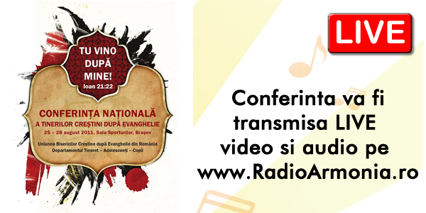 Astăzi, la Braşov a început tradiţionala conferinţă naţională de tineret BCER-UBCE. Evenimentul se desfăşoară în Sala Sporturilor şi are tema: “Chemarea la slujire” cu motto-ul “Tu vino după Mine” inspirat din Ioan 21:22. Chiar dacă nu ai reuşit să ajungi la Braşov, poţi fi parte la eveniment LIVE pe Radio Armonia.ro