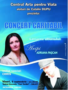 Vineri, 9 septembrie 2011, la Teatrul Dramatic “Fani Tardini” din Galaţi , se desfăşoară Concertul caritabil prilejuit de lansarea albumului “Aripi”, de Adriana Paṣcan.