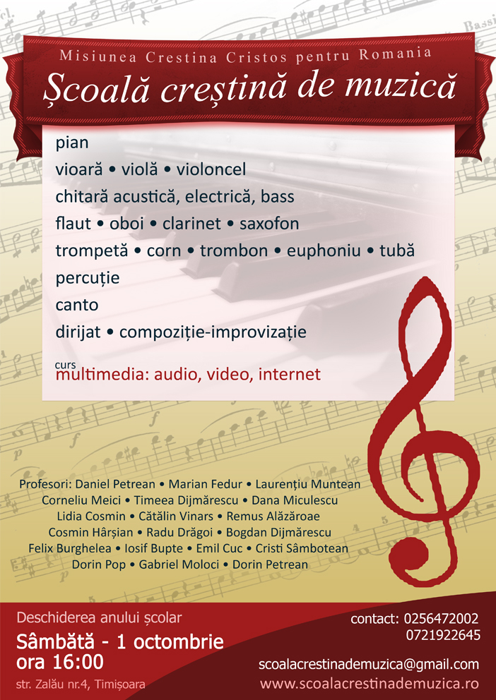 Pentru detalii şi înscrieri: Şcoala Creştină de Muzică, str Zalau nr 4, Timisoara, tel 0256472002, 0721922645