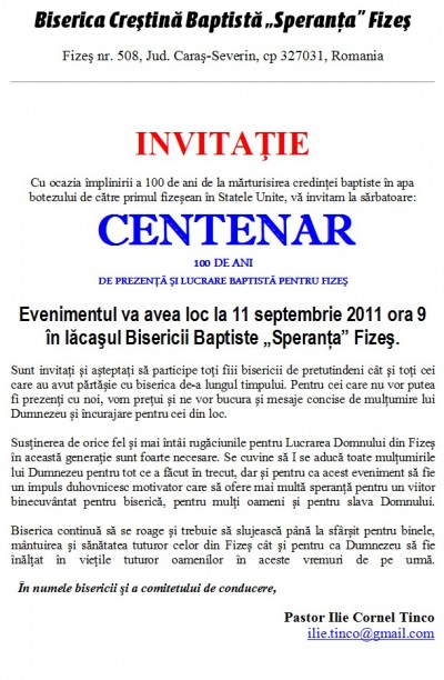 Duminică, 11 septembrie 2011, Biserica “Speranţa” din Fizeş, judeţul Caraş-Severin sărbătoreşte 100 de ani de fondare. La comemorarea încercărilor şi bucuriilor acumulate în aceşti 100 de ani sunt invitaţi toţi doritorii. Fiţi parte la bucuria familiei “Speranţa” din Fizeş, Caraş-Severin. Mai multe detalii vedeţi pe afiş.