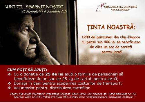 Organizaţia Creştină “Ecce Homo” desfăşoară în perioada 25 septembrie – 9 octombrie 2011 campania de ajutorare “Bunicii – semenii noştri” prin care un număr de 1200 pensionari cu pensii sub 400 de lei vor beneficia de câte un sac de 25 kg cu cartofi pentru iarnă.