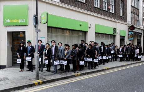 Un şir lung de tineri este văzut în faţa Centrului de Muncă în Charing Cross, Londra pentru a creşte nevoia de conştientizare a milionului de oameni tineri care nu au un loc de muncă în UK.