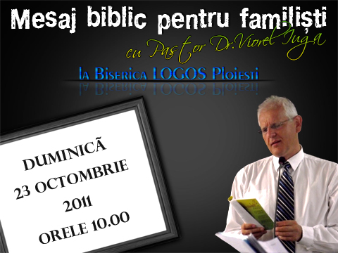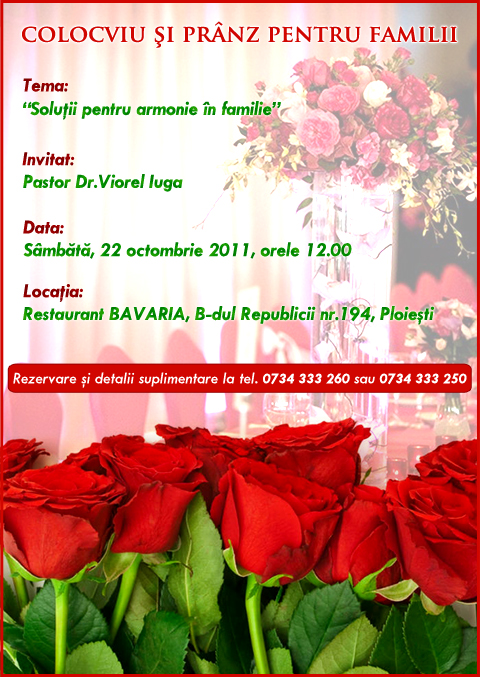 Începând cu ora 18:00 cei care nu au reuşit să ajungă la prânzul organizat la restaurantul Bavaria sunt invitaţi la o seară specială pentru familii la biserica “Logos” din Ploieşti. Alături de Alin şi Emima Timofte sunteţi invitaţi la un timp special de laudă şi închinare. Vorbitorul serii va fi pastorul şi scriitorul, Viorel Iuga.