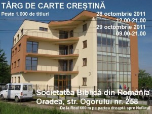 Dorești să citeşti cărţi bune, cu învăţătură morală creştină? Te aşteptăm vineri, 28 octombrie 2011, între orele 12 şi 21, şi sâmbătă, 29 octombrie, între orele 9 şi 21, la târgul de carte creştină organizat de Societatea Biblică din România la sediu sau pe str. Ogorului nr. 258, Oradea (de la Real 400 m pe partea dreaptă spre Nufărul).