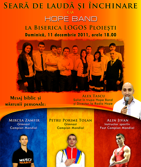 Cunoscut fiind faptul că Domnul Cel Sfânt locuiește în mijlocul laudelor” (Ps.22:3) și că aoamenilor fără prihană le șade bine cântarea de lauda” (Ps.33:1), Biserică LOGOS Ploiești consacră seara zilei de 11 decembrie 2011, începând cu orele 18.00, cântărilor de laudă, de adorare sfântă și închinare duhovnicească împreună cu Trupa Hope Band. O seară de laudă și închinare pentru toți credincioșii care se bucură de mântuire și în a căror inimi locuiesc cele mai sfinte dorințe de recunoștință la adresa Celui care ne-a adus salvare și, în același timp, un popas binevenit pentru orice suflet zbuciumat, prins în capcanele solicitărilor seculare și distructive de orice fel.