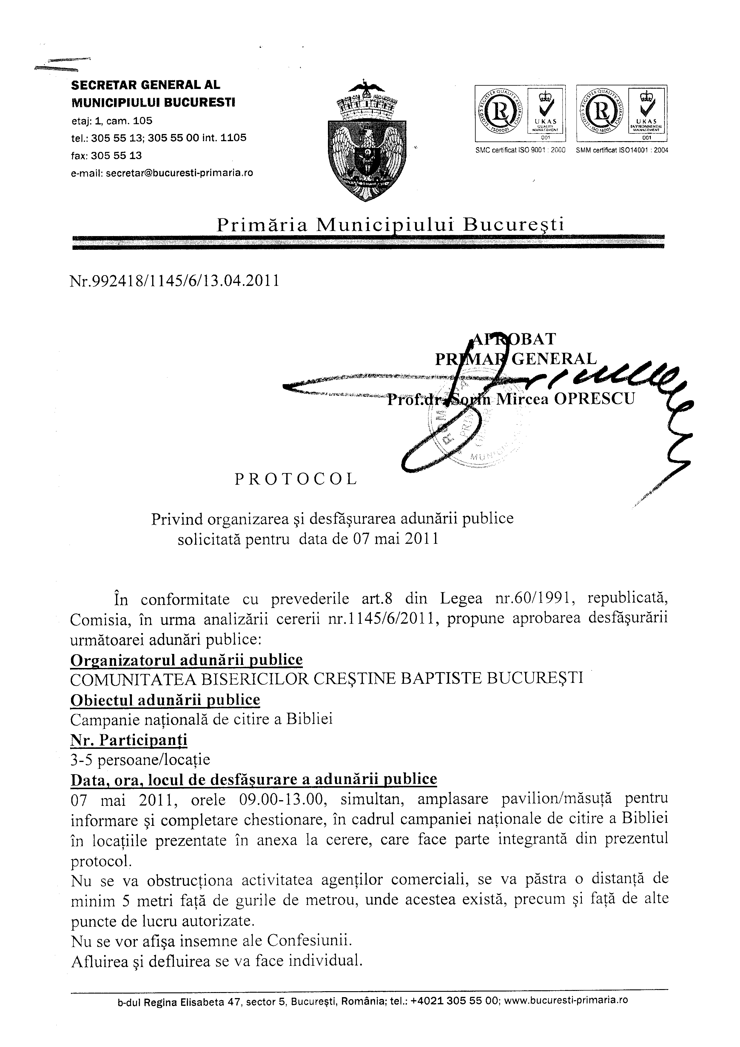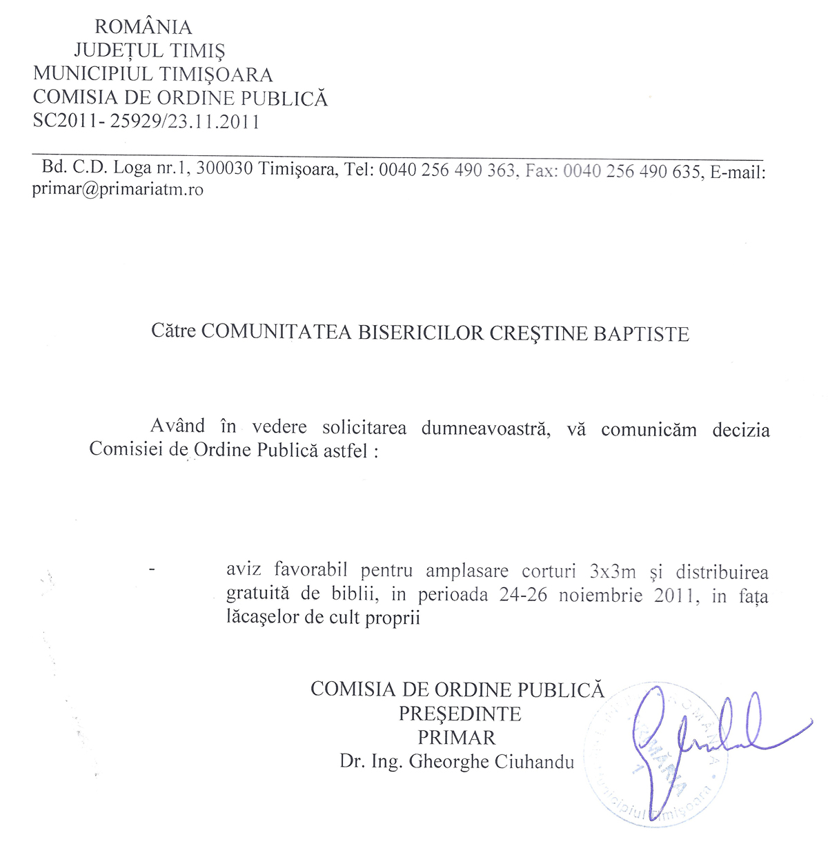 Deși în toate locurile mai sus amintite ni s-a permis distribuirea de Biblii în locurile publice, singurul oraș în care acțiunea noastră este restricționata doar în perimetrul clădirilor baptiste este orașul Timișoara. Ca o dovadă a acestui fapt vă trimit prin e-mail avizele de la Bucureşti și Timișoara.