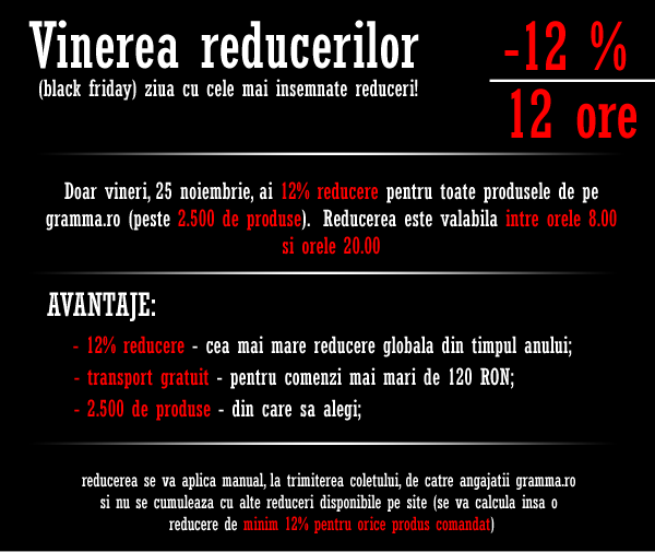 Share Facebook Twitter LinkedIn Pinterest Email Astăzi este şi pe gramma.ro black friday, şi cu ocazia asta oferim, timp de 12 ore, 12% reducere pentru orice comandă. Apreciază:Apreciază Încarc...