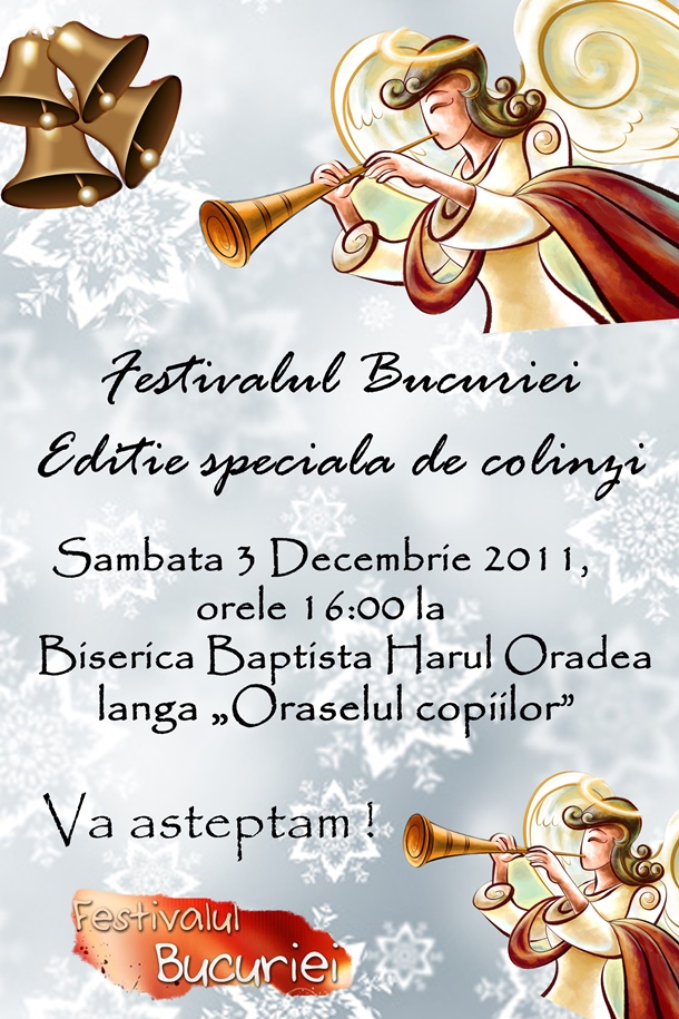 Share Facebook Twitter LinkedIn Pinterest Email Sâmbӑtӑ, 3 decembrie 2011, Biserica Baptistӑ “Harul” vӑ invitӑ la o ediție specialӑ de colinzi intitulatӑ “Festivalul Bucuriei” ce va avea loc ȋn Oradea, lângӑ “Orӑșelul copiilor”, ȋncepând cu orele 16:00. Vӑ așteptăm ! Apreciază:Apreciază Încarc...