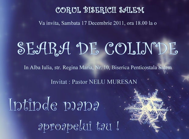 Share Facebook Twitter LinkedIn Pinterest Email Sâmbătă 17 decembrie 2011 în cadrul Bisericii Creștine Penticostale Salem din Alba Iulia str. Regina Maria nr.10 va avea loc o Seara de Colinde, invitat Nelu Muresan. Apreciază:Apreciază Încarc...