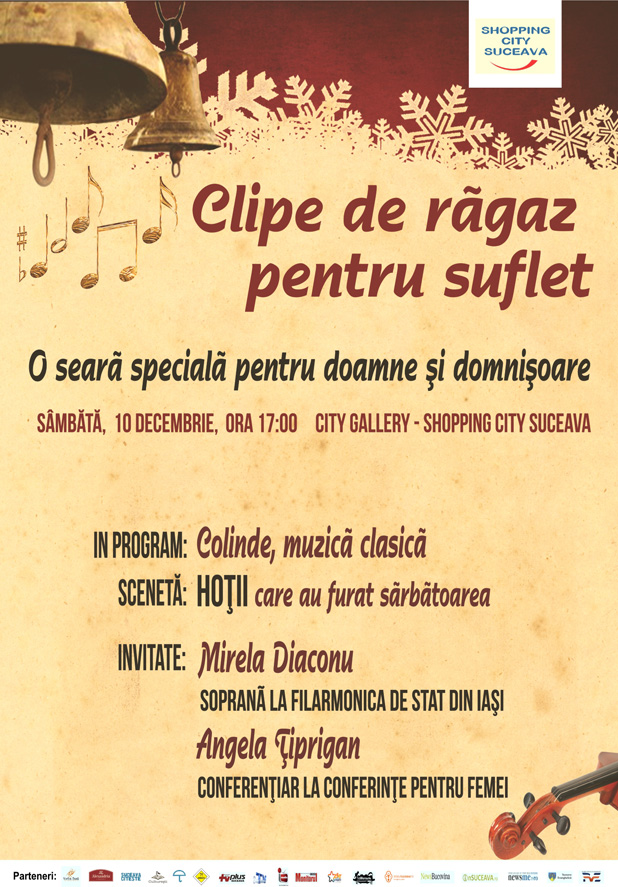 Shopping City Suceava, Vorba Bună şi Alexandria Librării vă invită la cea de-a doua ediţie “Clipe de ragaz pentru suflet”  care se va desfăşura sâmbătă, 10 decembrie, începând cu ora 17.00 în City Gallery din Shopping City. Va fi o seară specială pentru doamne şi domnişoare, un eveniment care are invitate speciale: doamna Mirela Diaconu – soprană a Filarmonicii din Iaşi şi doamna Angela Tiprigan – cunoscut conferenţiar la conferinţe pentru femei.