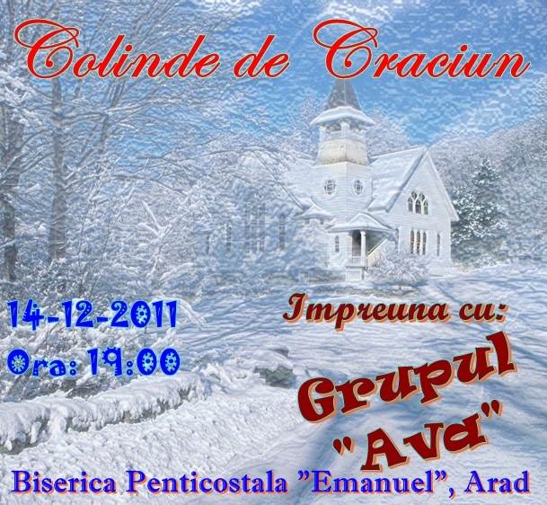 Biserica Penticostalӑ “Emanuel” din Comuna Vinga, județul Arad, vӑ invitӑ cu ocazia Sӑrbӑtorilor de iarnӑ și a Nașteri Domnului și Mântuitorului Isus Hristos, la un moment de Evanghelizare ȋncepând cu data de miercuri, 14.12.2011, ora 19:00. Vor fi prezenți dupӑ cum urmeazӑ: un grup de tineri copii din Arad, 60 la numӑr care ȋși vor uni vocile ȋn laudӑ si ȋnchinare cu Cântӑri de Colind. Va fi prezent, de asemenea, și Grupul AVA (Tatӑ). Vӑ așteptӑm pe toți. Dumnezeu sӑ vӑ binecuvânteze !