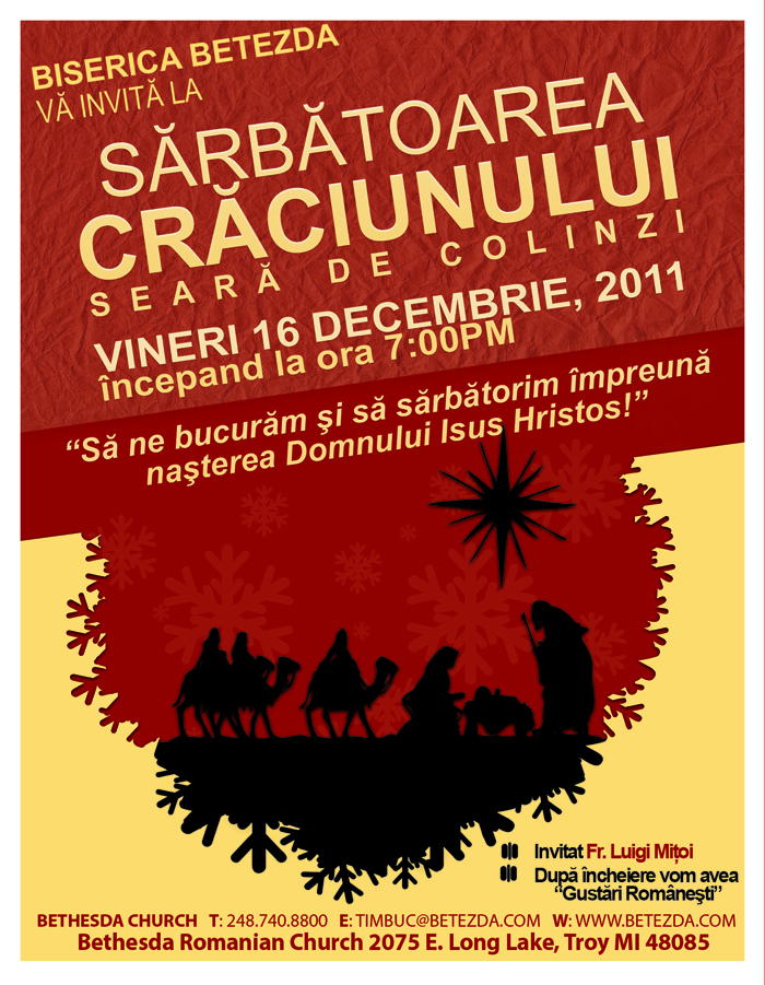 Share Facebook Twitter LinkedIn Pinterest Email Vă invităm vineri, 16 decembrie 2011, începând cu ora 7:00 pm, să ne bucurăm și să sărbătorim împreună nașterea Domnului Isus Hristos Invitați special: Luigi Mițoi, Chicago. După încheiere vom avea gustări românești. Apreciază:Apreciază Încarc...