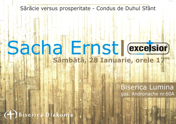 Sâmbătă, 28 ianuarie, orele 17:00, Biserica Diakonia organizează o conferinţă ce se va desfăşura în două sesiuni, cu următoarele teme: 1. Sărăcie versus prosperitate; 2. Condus de Duhul Sfânt, subiecte ce vor fi abordate având în considerare toate categoriile de vârstă. Evenimentul va avea loc în sala Bisericii Lumina, din şos. Andronache, nr. 60A, sector 2, Bucureşti. Mesajele vor fi susţinute de Sacha Ernst, misionar în ţările comuniste şi pastor al unei biserici din Elveţia. Timpul de închinare prin muzică, va fi condus de formaţia Excelsior.