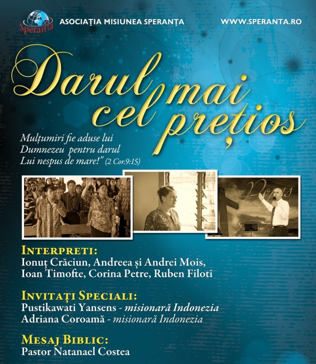 Ȋn intervalul 10 – 26 februarie 2012, Misiunea Speranța prin pastorul Natanael Costea va organiza o serie de programe evanghelistice sub genericul “Darul cel mai prețios”. Evanghelizӑrile se vor desfasura ȋn bisericile locale din 11 localitați dupӑ programul afișat mai jos. Cântӑrile de laudӑ și ȋnchinare vor fi susținute de Ionuț Crӑciun, Andreea și Andrei Mois, Ioan Timofte, Corina Petre și Ruben Filoti.