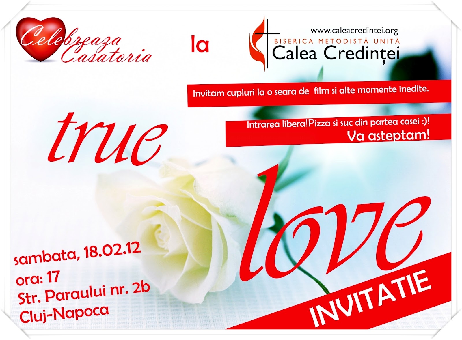 Biserica Metodistă Unită “Calea Credinței” ( www.caleacredintei.org) din Cluj-Napoca, str. Pârâului nr. 2b, invită cuplurile la o seară specială de film și pizza.
