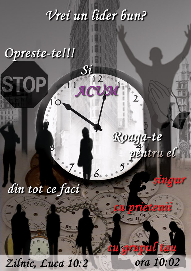 Astfel că mi-am pus ceasul de la telefon ca în fiecare zi la ora 10:02 să sune şi, indiferent de locul în care sunt, închid ochii şi spun o rugăciune scurtă, de o clipă, ca Dumnezeu să binecuvânteze biserica mea cu lideri după voia Lui, oameni după inima Lui, oameni prin care fiecare grup de rugăciune, fiecare lucrare de misiune, fiecare cuvânt care se predică, fiecare repetiţie de cor, fiecare altă lucrare să fie binecuvântată şi să crească. Vă invit să faceţi la fel şi să daţi mai departe. Domnul Isus să vă binecuvânteze. Este ora 10:02 AM pentru că textul este din Luca 10:2 :)”