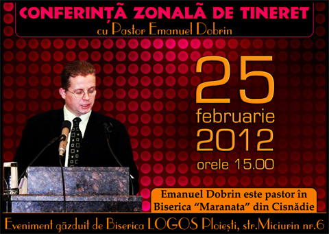 Sâmbătă, 25 februarie 2012, începând cu orele 15.00, Biserica “Logos” Ploieşti va găzdui un nou eveniment de interes pentru tinerii prahoveni şi nu numai, primul planificat pentru acest an şi aşteptat cu mare nerăbdare: Conferinţa Zonală de Tineret.