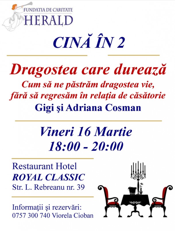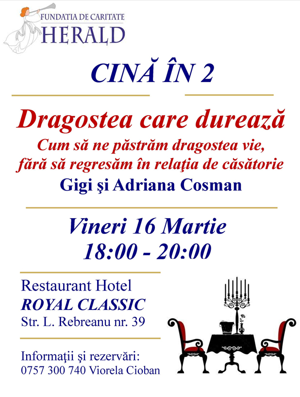 Vineri, 16 martie, orele 18:00 – 20:00, Fundaţia de Caritate Herald îi invită pe cei căsătoriţi la Restaurantul Hotelului Royal Classic, la un