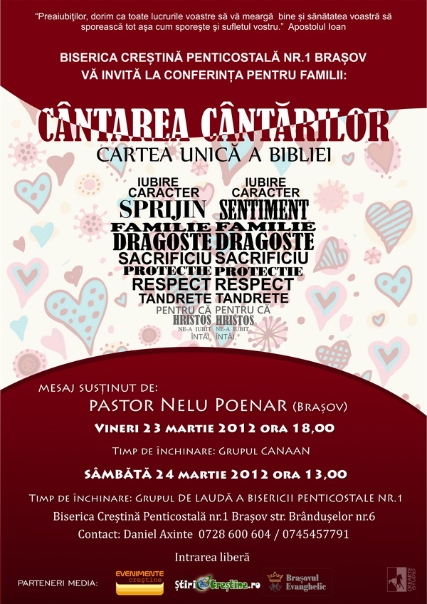 Biserica Creștinӑ Penticostalӑ Nr. 1 din Brașov  vӑ invitӑ la Conferința pentru familii intitulatӑ “Cartea Cântӑrilor – Cartea unicӑ a iubirii”.