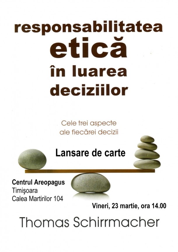 Va invităm să participaţi vineri, 23 martie 2012, de la ora 14.00, la lansarea cărţii Responsabilitatea etică în luarea deciziilor, de Dr. Thomas Schirrmacher. Acest eveniment se va desfăşura în prezenţa autorului la Centrul Areopagus din Timişoara (Calea Martirilor nr. 104).
