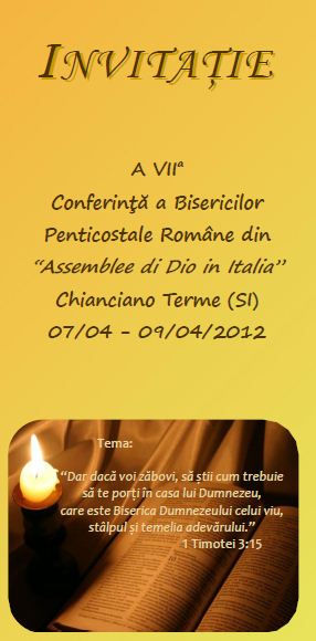 În 7, 8, 9 aprilie 2012, în localitatea Chianciano Terme (SIENA) va fi organizată a VII-a Conferinţă a Bisericilor Penticostale Române afiliate la Assemblee di Dio in Italia. Toţi cei care doresc să participe sunt bineveniţi. Tema conferinţei este din 1 Timotei 3:15: „Dar dacă voi zăbovi, să ştii cum trebuie să te porţi în casa lui Dumnezeu, care este Biserica Dumnezeului celui viu, stâlpul şi temelia adevărului.”