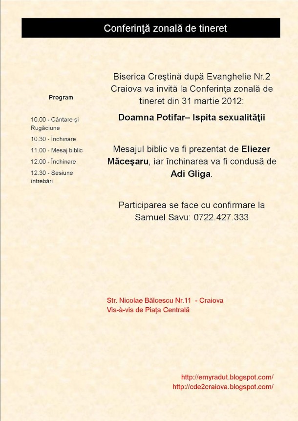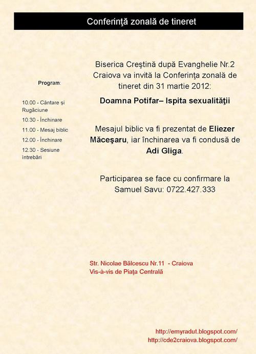 Share Facebook Twitter LinkedIn Pinterest Email Biserica Creștină după Evanghelie nr. 2 Craiova vă invită la Conferința zonală de tineret din 31 martie 2012. Tema conferinței: “Doamna Potifar” – Ispita sexualității Apreciază:Apreciază Încarc...