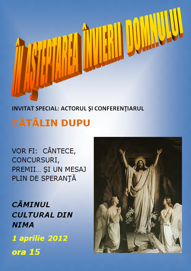 Cunoscutul conferențiar și actor creștin, Cătălin Dupu, va veni pe 1 aprilie 2012 la Gherla, Nima și Iclod.