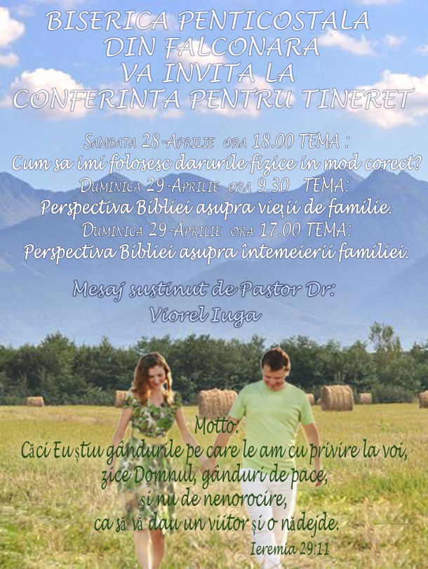 Biserica Penticostală Română din Falconara, ITALIA organizează în zilele de sâmbătă, 28 aprilie, ora 18, şi duminică, 29 aprilie, ora 9,30 şiora 17, conferinţa pentru tineret cu tema CURAT ÎNTR-O LUME MURDARĂ.