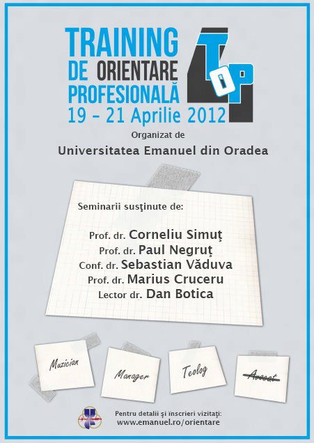 Universitatea “Emanuel” din Oradea organizează cea de a IV-a ediţie a Trainingului de Orientare Profesională în perioada 19 – 21 aprilie 2012. Acest seminar se adresează elevilor de liceu care plănuiesc să urmeze studii de grad universitar.