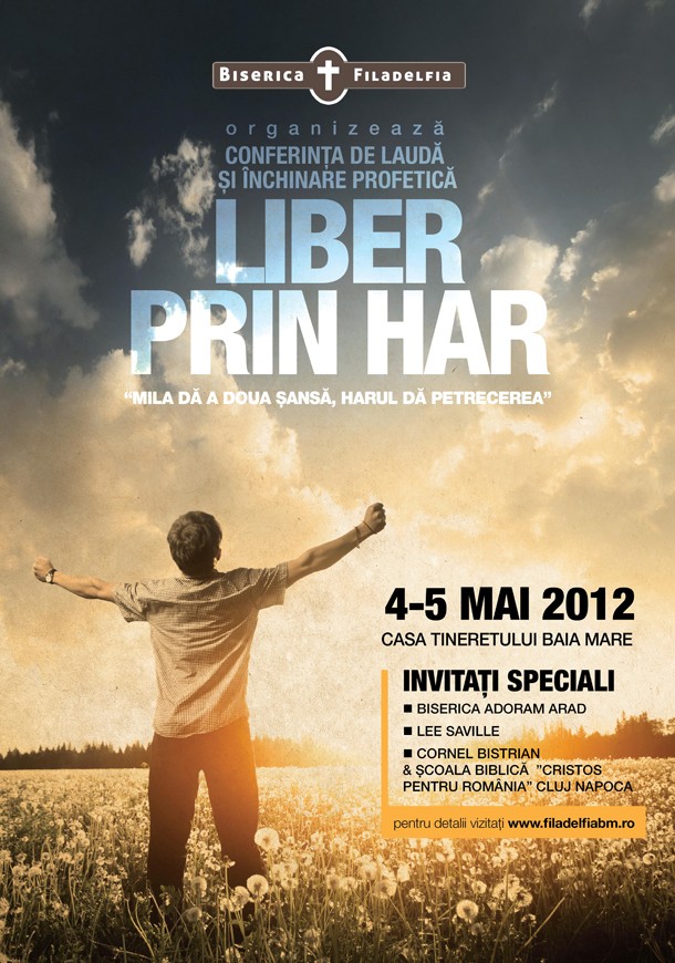 Avem bucuria de a anunţa în mod oficial Conferinţa de laudă şi închinare profetică “Liber prin har” – organizată de Biserica “Filadelfia” Baia Mare în perioada 4 – 5 mai 2012.