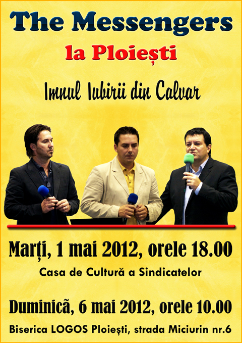 Dacӑ ȋncӑ nu ai aflat, modificӑ-ți urgent agenda pentru cӑ ȋn luna mai a acestui an, apreciații soliști creștini care compun Grupul The Messengers vor efectua un nou turneu evanghelistic ȋn România, sub genericul “Imnul Iubirii din Calvar”. Dupӑ o lungӑ perioadӑ de așteptare, ȋn data de 1 mai 2012, ȋncepând cu orele 18.00, vor poposi, ȋn sfârșit, la Ploiești, la Casa de Culturӑ a Sindicatelor, pentru o searӑ menitӑ sӑ cerceteze și sӑ ȋnalțe duhovnicește sufletele participanților prin cântӑrile ce vor fi interpretate cu aceastӑ ocazie.