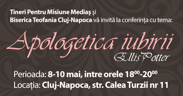 Tineri Pentru Misiune Mediaș și Biserica “Teofania” Cluj-Napoca vă invită la o conferință cu tema “Apologetica iubirii”, în perioada 8-10 mai, între orele 18:00 – 20:00.