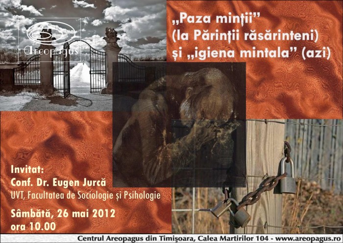 Vă invităm să participaţi sâmbătă, 26 mai, ora 10, la forumul cu tema “Paza minţii” (la Părinţii răsăriteni) şi “igiena mintală” (azi). Întâlnirea se va desfăşura la Centrul Areopagus din Timişoara (Calea Martirilor nr. 104) şi îl va avea ca invitat pe domnul Conf. univ. dr. Eugen Jurcă (Universitatea de Vest din Timişoara, Facultatea de Sociologie şi Psihologie).