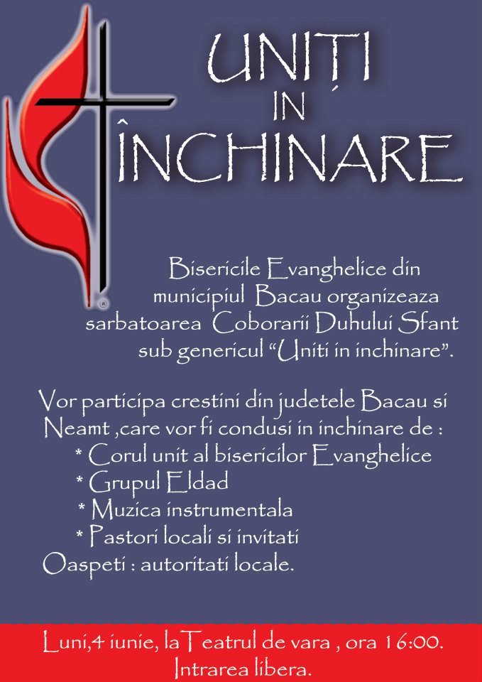 Luni, 4 iunie 2012, la Teatrul de vară, începând cu ora 16:00, Bisericile Evanghelice din municipiul Bacău vor organiza sărbătoarea Coborârii Duhului Sfânt sub genericul “Uniţi în închinare”.