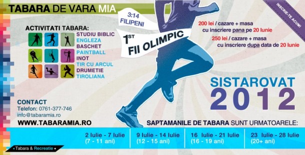 Tabăra de vară MIA (Misiune în acţiune) se va desfăşura şi anul acesta la Şiştarovăţ, în perioada 2 iulie – 28 iulie 2012.