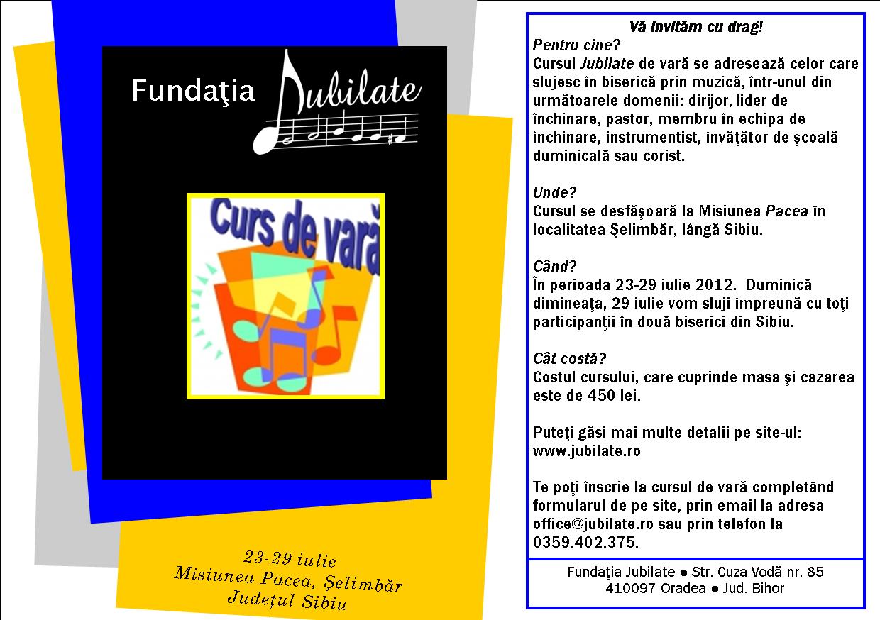 Te poţi înscrie la cursul de vară completând formularul de pe site, prin email la adresa office@jubilate.ro sau prin telefon la 0359.402.375