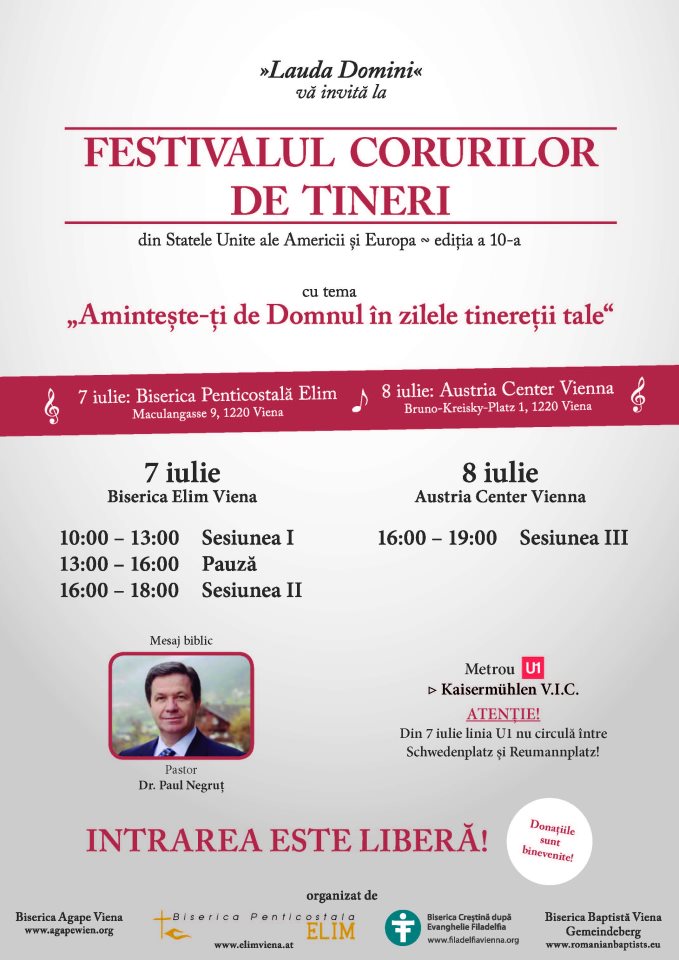 “Lauda Domini” vă invită la Festivalul Corurilor de Tineri din Statele Unite ale Americii şi Europa – ediţia a 10-a – cu tema “Aminteşte-ţi de domnul în zilele tinereţii tale”.