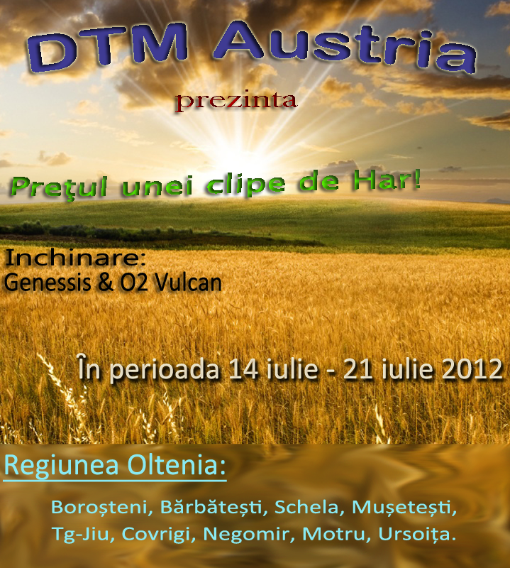 Ȋn perioada 14 iulie – 21 iulie 2012, Departamentul de Misiune al Tinerilor din Austria (DTM Austria), vor reveni în Oltenia şi anul acesta pentru o săptămână de evanghelizare.