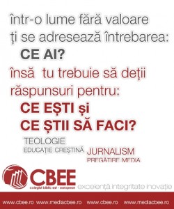 3. Prezentarea unui proiect în oricare din domeniiile media: presă scrisă, internet, fotografie, etc., din care să reiasă interesul candidatului pentru un anume domeniu media. Pentru mai multe informații, scrieți la admitere@cbee.ro sau eebc@rdslink.ro
