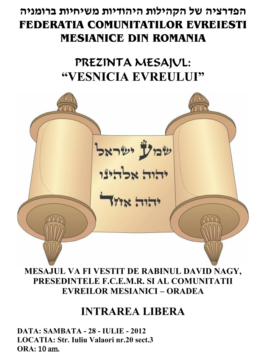 Federaţia Comunităţilor Evreieşti Mesianice din România şi Comunitatea Evreilor Mesianici Bucureşti organizează întrunirea cu tema: “Veşnicia Evreului”, în data de 28 iulie 2012, de la ora 10:00 – 12:30.
