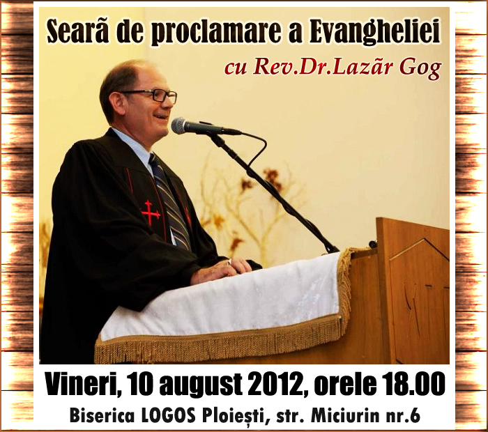 Acesta este şi temeiul organizării în data de vineri, 10 august 2012, începând cu orele 18.00, a unei Seri de proclamare a Evangheliei cu apreciatul slujitor al Ȋmpărăţiei lui Dumnezeu, Rev.Dr.Lazăr Gog. Evenimentul va fi găzduit de către Biserica “Logos” Ploieşti, strada Miciurin, nr.6.